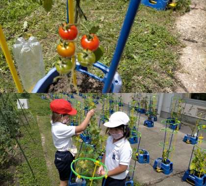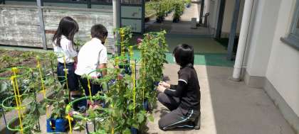 6/21(月)1年生のアサガオのつるがぐんぐんと伸びています。2年生の野菜(ミニトマト、きゅうり、なす)も順調に育っています。