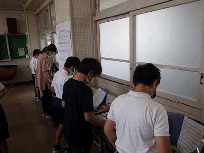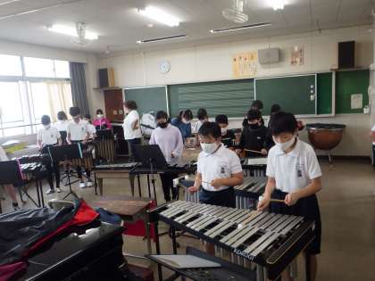 コロナ禍でずっと部活動ができなかったのですが、29日(火)より、ようやく再開しました。金管バンド部は、管楽器の演奏がコロナ感染防止の観点から難しいため、打楽器での演奏・練習となっています。