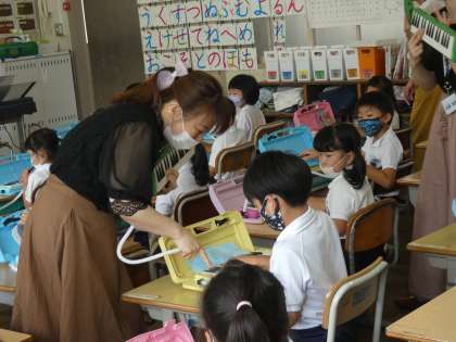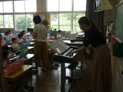 1年生の音楽の授業では、ヤマハ音楽教室の先生方を講師にお招きし、鍵盤ハーモニカの講習会を行いました。講師の先生方の指導に合わせて、子どもたちは一生懸命取り組んでいます。