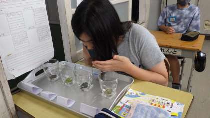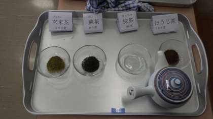5年生が、家庭科「自分にできそうな家庭の仕事を見つけよう」の学習で、お茶の入れ方を学んでいました。煎茶や抹茶の良い香りを確かめました。