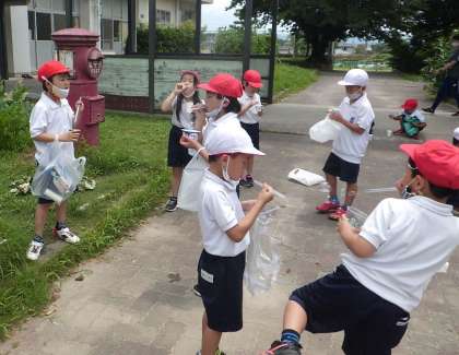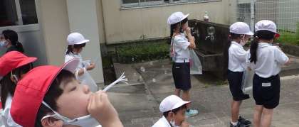 1年生が生活科でシャボン玉を作っていました。