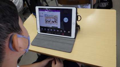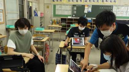 学習用タブレットを使ったオンライン学習のよりよい方法を先生たちも勉強しています。5年生の教室で、子どもたちもオンラインの学習方法を学んでいました。