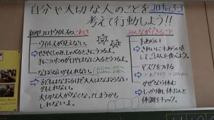 それぞれのクラスで、子どもたちが感染症予防を意識できるような工夫をしています。教室に入る前の手洗いを呼びかけたり、効果的なマスクのつけ方や活動するときの注意点を話し合ったりしています。