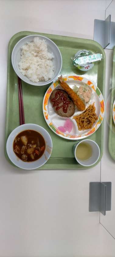 施設内の食堂、どんぐり食堂で夕食です。対面はアクリル版で仕切られています。