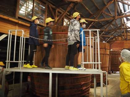 とても大きく長い歴史を感じさせる木製の大桶。美味しい味噌を作るために工場内に流れ続けるオルゴールの優しいメロディ。1年半熟成されている味噌の香り。目には見えないけどこの工場全体に漂っている酵母菌・・・説明を聞きながら、味噌をはじめとする食品の大切さについて学ぶ機会になりました。