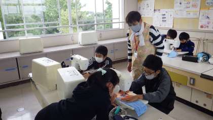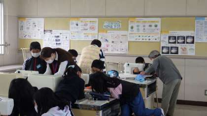 先月行った6年生に続いて、今月は5年生の家庭科・ミシン実習で学校支援ボランティアの方々のご指導を受けています。22日はボランティア・担当教師、担任の8名で実習指導を行いました。1名の教員で教えられる範囲はどうしても限られてしまいます。多くの方々が実習のお手伝いをしてくださることで、ミシンの正しい使い方を学び、実習を進めることができました。