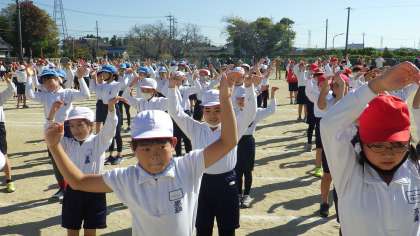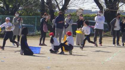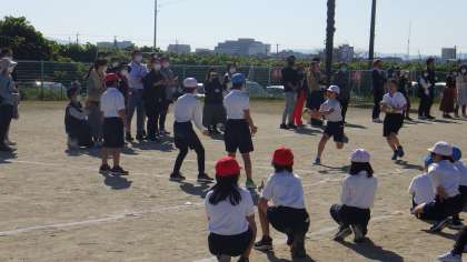 4年生は障害物リレー「難関乗り越えみんなでつなげ〜ONE FOR ALL〜」を行いました。4年生は競技の途中でダンスが入ります。一生懸命クラスの子の走りを応援している途中でダンスのメロディが始まると、応援をやめ、全員立ち上がり息をそろえてダンスを始めます。メリハリがあって、とても充実した競技になりました。