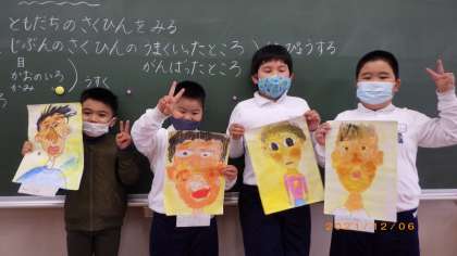 6組の図工の時間に、「じぶんのかお」をかきました。鼻やあごは、どんな形になっているのかさわって確かめました。髪の毛やまゆげは一本一本ていねいにかきました。肌の色は、絵の具を少しずつ混ぜてくふうしました。とてもすてきな作品ができました。