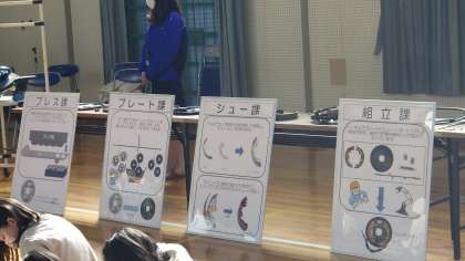コロナ禍でなければ実際に工場に出かけ、自動車部品ができる工程を見学するのですが、今回は工場の方がわざわざ本校に来校してくださり、実際のブレーキなどを展示しながら説明をしてくださいました。