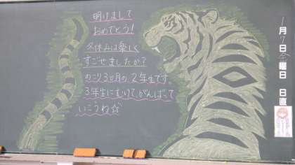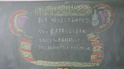 久しぶりに登校した子どもたちを迎えるために、多くの学級では担任から黒板いっぱいの新年のメッセージが書かれていました。