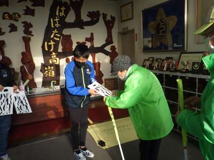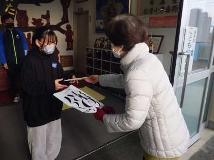 体育館にお集まりいただき、直接、子どもたちからお礼の言葉を届けたいのですが、この状況のため、玄関にメッセージを掲示し、学校の代表として委員会の子がお礼の品をお渡ししています。