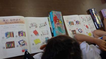 10日(火)は1年生に本の扱い方や、図書室の使い方、本の見つけ方などの学習を進めてくださいました。