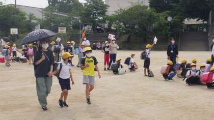 今回のお迎え訓練は豊田市内で震度5以上の地震が発生し、児童の安全のため運動場にて引き渡しを行いました。