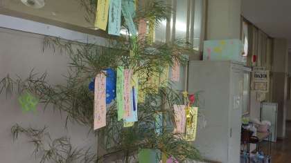 学校のあちこちに、笹の葉に願い事がつるされています。