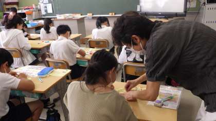 5年生が、家庭科で、なみぬいの仕方を練習しました。やり方を教わると、どの子も真剣な表情で練習を始めました。