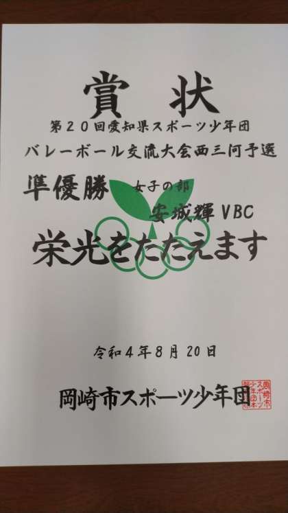 8月20日に行われました「第20回愛知県スポーツ少年団バレーボール交流大会」西三河予選において、本校の児童が所属するチームが準優勝の栄誉に輝きました。