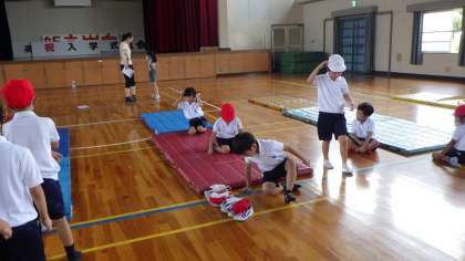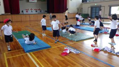 1年生が、体育科でマット運動をがんばっていました。前回りがとてもスムーズにできています。シューズもしっかりそろえておいてあります。成長している様子がうかがわれます。