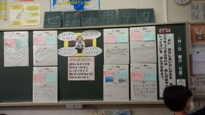 1年生が、国語科「サラダでげんき」の勉強をした後、オリジナルサラダに入れる食材をグループで話し合う学習をしました。「話し合い名人」になるための方法を学び、自分たちで司会進行をし、理由を話しながらなかよく話し合うことができました。