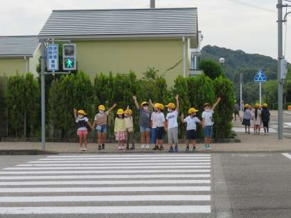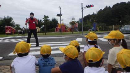 ホールで交通事故に遭わないための学習をした後、屋外に出て、学習したことをいかして安全に道路を横断したり、車に注意したりする練習をしました。