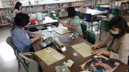 傷んだ本の修復や、図書室の飾りやレイアウトの工夫、さらには、季節に合わせた本の紹介などを学校図書館司書さんとともに行ってくださっています。
