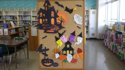 今、本校の図書館に入ると、ハロウィン仕様の飾りや本の紹介がされています。