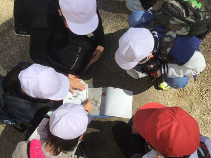 子どもたちは班ごとにオリエンテーリングに出かけました。地図を頼りに山の中にあるいくつかのポイントを探します。