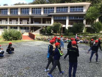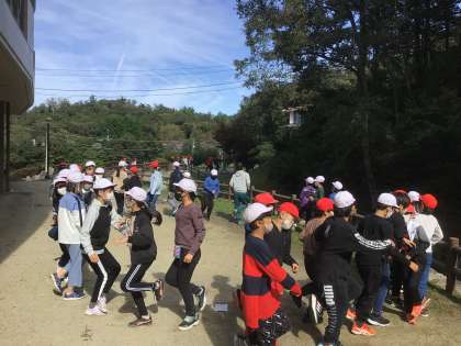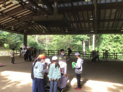 学級ごとに分かれて、キャンプファイヤーの出し物の練習をしています。