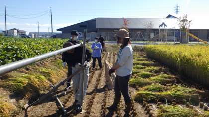 昨年は刈り取った後、コンバインで脱穀まで行いましたが、今年は稲架掛けを行い田で乾燥させた後、脱穀することにしました。