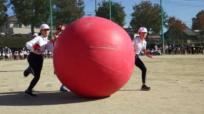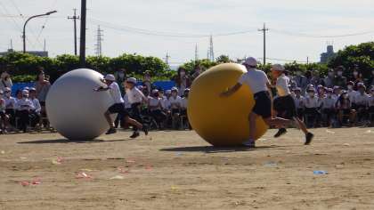「きずなを深めろ!」のタイトルの通り、チームワークで大きな玉をコントロールしながら転がしました。