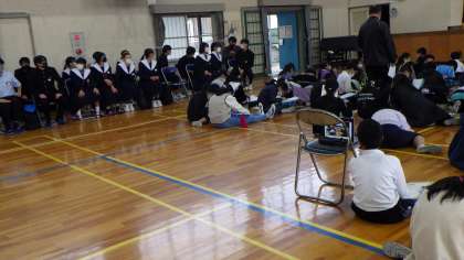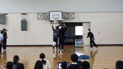 また4年生の児童にバレー部の生徒が即興で、バレーの練習スタイルを披露してくれました。交流学習以上に盛り上がりました。