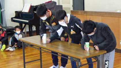 5年生はサッカーリフティングに遠投、ダイススタッキングなどを披露しました。