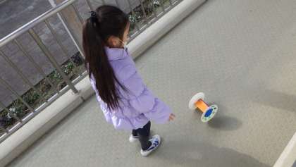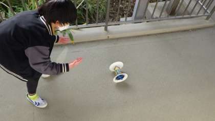 色紙やペンで思い思いにかざりつけ、バランスよくころがるように工夫しました。体育館への通路でみんなでころがしました。