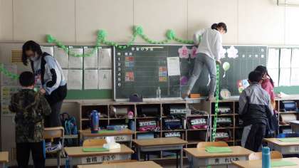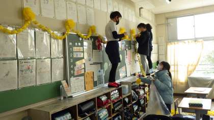 6年生が体育館で送る会を過ごし、在校生がみんな映像を見ている裏で、5年生の飾りつけスタッフが6年生の各教室に行き、鮮やかに華やかに教室を飾っていました。