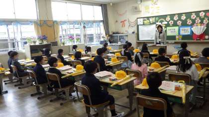 1年生は親と離れて、それぞれの学級で入学式の練習をしました。
