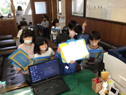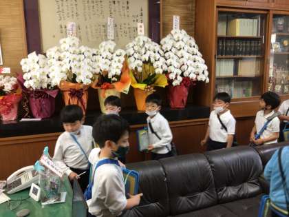 2年生が生活科の授業で学校探検をしました。 校長室にも入り、何があるか調べました。