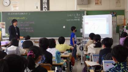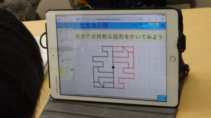 6年生が算数科で「点対称」の図形をかく学習をしていました。学習用タブレットを使って、だんだん難しくなる図形をかくことに挑戦し、どのような点対称の特徴を使ってかいたのか説明しました。