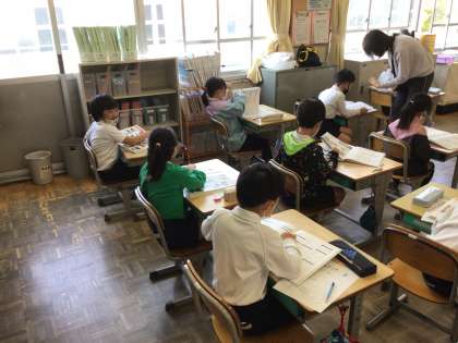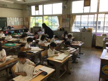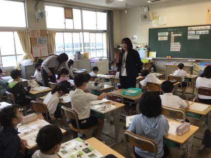 2年生の教室に豊田市中央図書館の方に来ていただき、出前授業を行いました。
