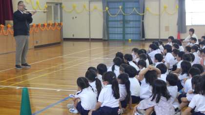 体育館には1年生と6年生と発表する学年しかいませんでしたが、この歓迎会の様子はオンラインで各学級とつながって放送されました。