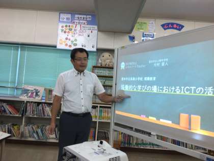 児童下校後、上郷中学校教頭先生とSky株式会社の方を講師に、ICTの研修を行いました。