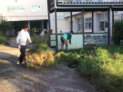 朝6時活動開始という早朝の活動にも関わらず総勢20名以上の参加者が1時間に渡り運動場や校舎と校舎の間、花壇周辺など草刈りや掃き掃除などをしてくださいました。通常の学校支援ボランティアさんに加え、今回初めてこういった活動に参加する方もいらっしゃいました。