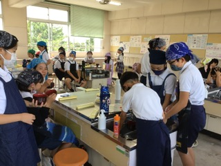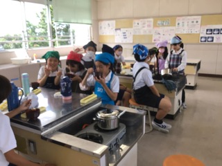 5年生が10月の山の学習に向けた準備の一つとして、家庭科でカレー作りをしました。身支度を整え、協力しておいしいカレーが完成しました。きっと本番でも大成功ですね!