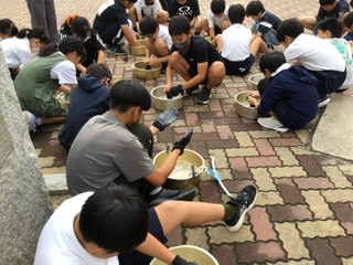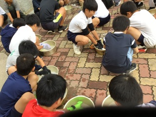 6年生が、家庭科で洗濯の仕方を学び実習をしました。「もみ洗い」「つまみ洗い」「こすり洗い」をしました。靴下がとてもきれいになりました。