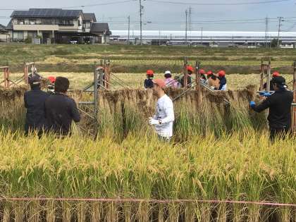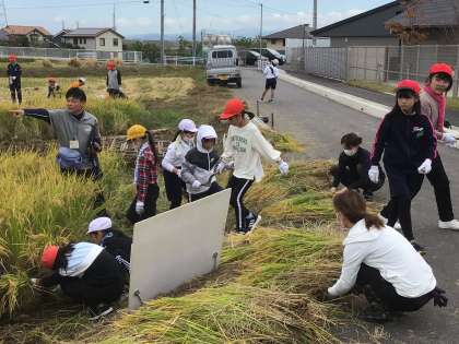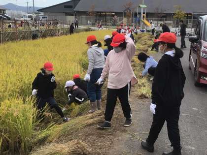 今日は、5年生が地域の方・PTAの方にご協力いただき、稲刈りを行いました。