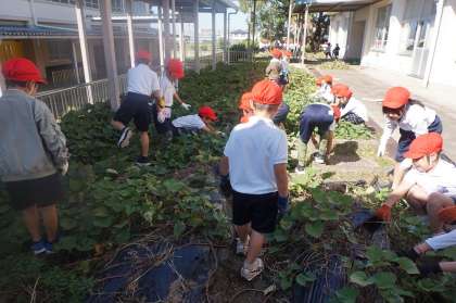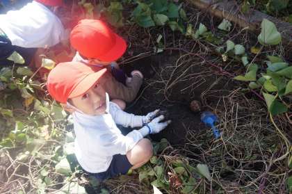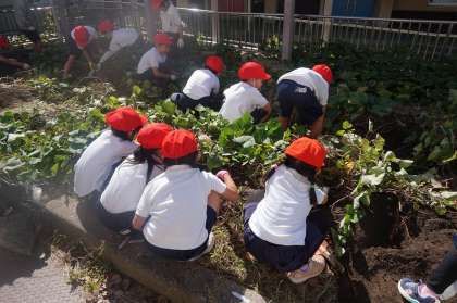 学年畑で、大きく育ったサツマイモを、1年生の子たちが芋ほりをしています。