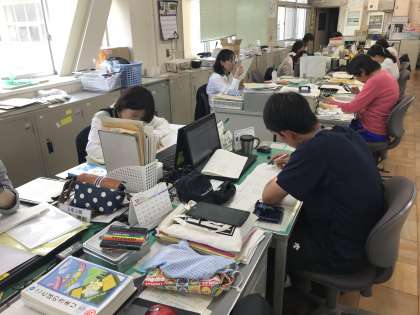 児童下校後、先生たちは今年の6年生が解いた全国学力テストを実際に解いてみて、傾向を分析しました。