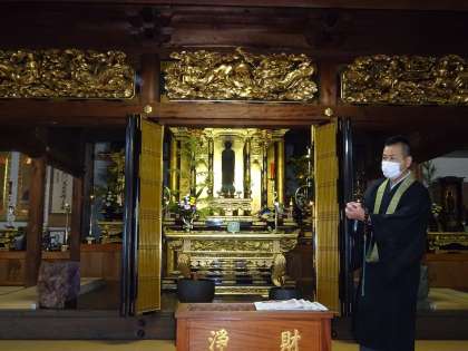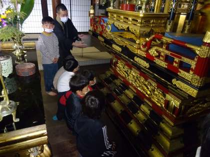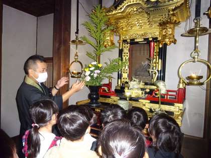 和会町の弘願寺では、住職さんから仏像やお寺の歴史、寺の様々な物について説明を受けました。