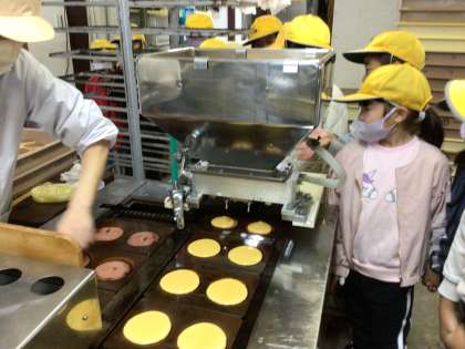 学校のすぐそばにある福寿園の見学では、目の前でおいしそうなどら焼きができていく様子を見ることができました。