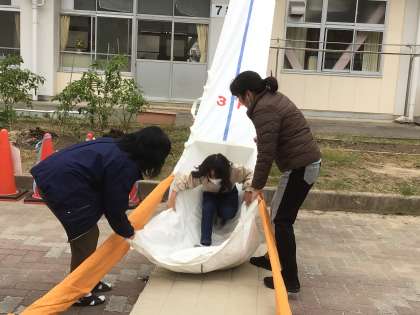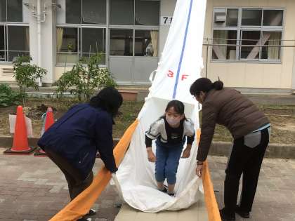 3年生の避難救助袋体験です。