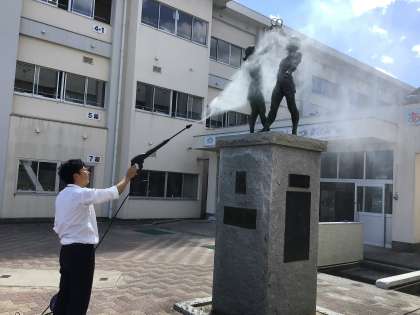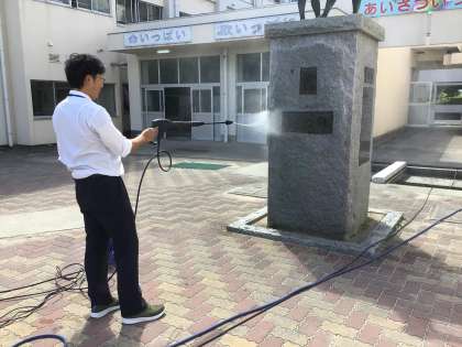 教務主任の安藤先生が、高圧洗浄機を使って高嶺小学校の象徴である「七つ輪」のモニュメントの掃除をしていました。
