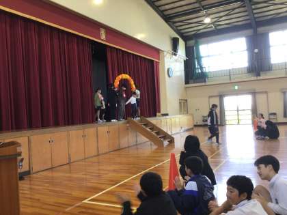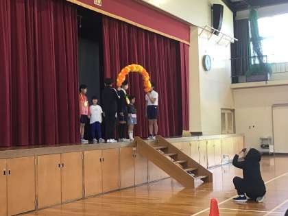 手作りのメダル。2年生から5年生の学校紹介。6年生の学校クイズと盛りだくさんの会となりました。